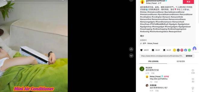 视频中,一位女士将迷你空调放在厨房、卧室、书桌等场景,展示操作方法和使用效果,并且将产品拆解开,细致地解读迷你空调运行原理,测试空调的温度和制冷速度,生动有趣该视频吸引了1200万次观看,获得20.1万次点赞,这款可随手拆卸携带的迷你空调掀起TikTok用户购买狂潮