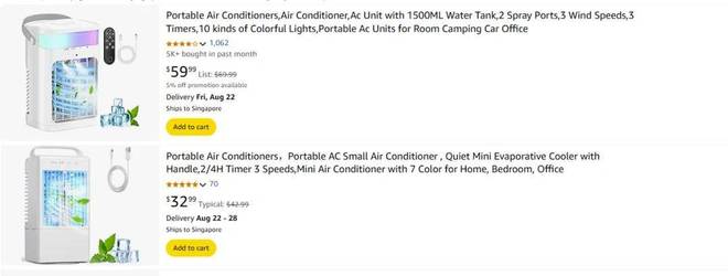 在亚马逊美国站上,便携式空调种类繁多,一般售价在19.9美元——69.99美元,NPOCLK店铺中定价59.99美元的迷你便携空调扇上个月卖出