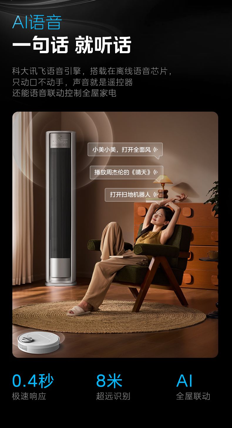 产品还支持AI语音智控,内置第二代离线语音芯片及科大讯飞语音引擎,响应速度仅0.4秒,用户一句话即可操控全屋家电。同时,其APF值高达5.25,更搭载AI酷省电科技,兼顾节能与经济性。