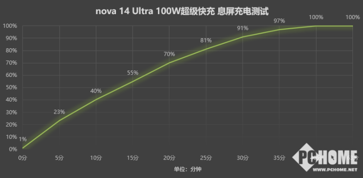 充电方面,nova 14 Ultra支持100W华为超级快充Turbo,而且标配了更加迷你便携的华为冰糖全能充电器(Max 100W)。经过实测,nova 14 Ultra 30分钟便将手机从1%充至91%、充满仅用了40分钟,完全充满用了63分钟。